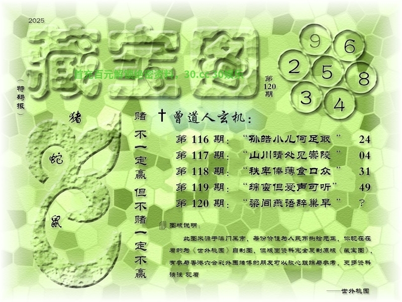 124期藏宝图:【资料正在更新中】 浅解:资料正在更新中 综合生肖:资料正在更新中 |